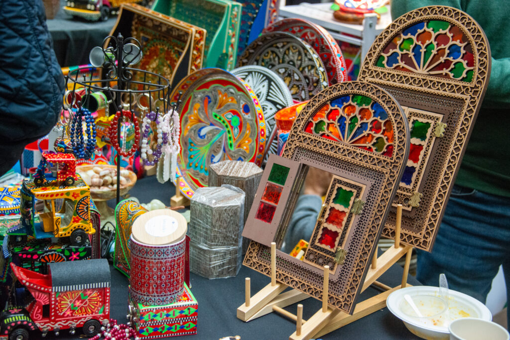 For example, the booth featured jewelry decorated with gemstones from Pakistan’s mountains, as well as fine pashmina shawls. Pakistani craftsmanship was also on display, including blue pottery and handcrafted camel skin lamps from Multan and “truck art” originating from Karachi.